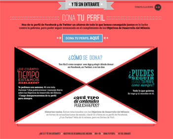 Tomar parte en la iniciativa “Y tú sin enterarte” es muy sencillo: sólo hay que entrar en la web de la campaña y descargarse la aplicación gratuita que nos permite donar nuestro perfil en las redes sociales. Una vez en la página en cuestión, podemos elegir ceder nuestro espacio en Facebook, en Twitter o en las dos, ubicando la opción DONA TU PERFIL. El gesto solidario tiene una duración de una semana, prorrogable a otra más, y cada día, desde el perfil del usuario se lanzará automáticamente un mensaje que destacará algunos de los logros que se han conseguido para combatir la pobreza o bien cualquier otro de los Objetivo del Milenio. Una vez que haya finalizado la campaña, la aplicación desaparecerá.