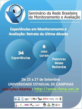 A riesgo de que se me note en demasía cuánto me gusta Brasil, luego de haber presentado hace unos días a la Rede Brasileira de Monitramento e Avaliaçao, quiero hacer una breve mención a su muy próximo V Seminário Nacional. Continuando con la fantástica práctica de darle regularidad a los mismos, a fines de Septiembre de este convulsionado 2013, se reunirán en la bella ciudad de Campinas, y más concretamente en las fantásticas instalaciones de la Unicamp.