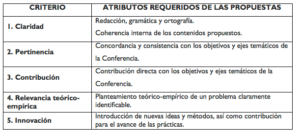 Desde la perspectiva global del evento, la evaluación de las propuestas contemplarán como criterio complementario el equilibro de participación según la diversidad: (a) de países y regiones; (b) de la academia, la sociedad civil, el ámbito público y privado; c) de sectores de los programas y políticas; d) de instancias municipales, provinciales e federales; e) de evaluadores jóvenes, emergentes y profesionales con amplia experiencia; f) de perspectivas que involucran, por ejemplo, género, derechos humanos, etnia y culturas.