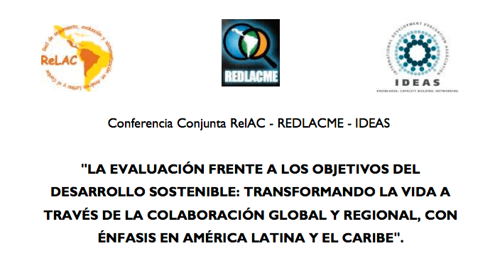 Las redes regionales de evaluación ReLAC, REDLACME y la asociación global de evaluadores IDEAS hemos unido esfuerzos, en este año 2017, para organizar una conferencia conjunta donde reflexionemos y dialoguemos a fondo para desarrollar rutas de acción y prácticas evaluativas que incidan en mejorar la calidad de vida de las personas de diversas realidades alrededor del mundo, especialmente de América Latina y el Caribe. Durante este importante encuentro, se presentarán diferentes enfoques, metodologías, marcos institucionales y aprendizajes en monitoreo, evaluación y sistematización. Este evento se organizará en el marco del compromiso global de alcanzar los ODS y adoptar medidas que promuevan el desarrollo humano, la protección del planeta y las garantías necesarias para que todas las personas gocen de sus derechos, en un ambiente de paz.
