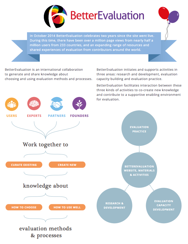 Hace dos años, durante la conferencia de la Sociedad Europea de Evaluación en Helsinki, el sitio BetterEvaluation.org se puso en marcha para el acceso público. Habíamos estado trabajando con un grupo internacional de beta-socios para desarrollar el sitio antes de este tiempo.
